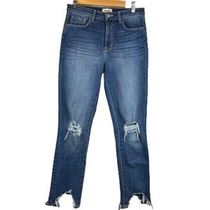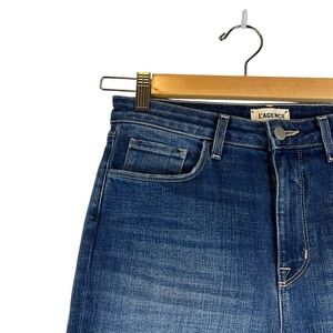 Keywords: L’AGENCE jeans, mid-rise jeans, distressed jeans, straight leg jeans, raw hem, frayed hem, designer denim, blue jeans, casual jeans, premium denim, stretchy jeans, cropped jeans, ankle jeans, trendy jeans, chic jeans, high-end denim, fashionable jeans