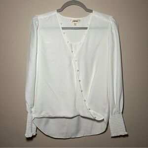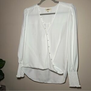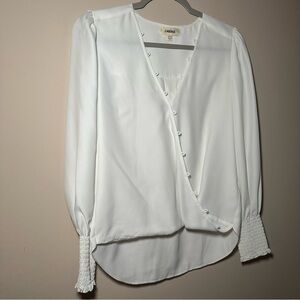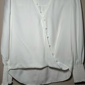 Chic cross front blouse with delicate smocked cuffs. V-neckline and button accents. Ideal for versatile styling. The color on the website is called ivory but this shirt is white as can be seen in photos. There are some small spots on top so please look at photos thoroughly