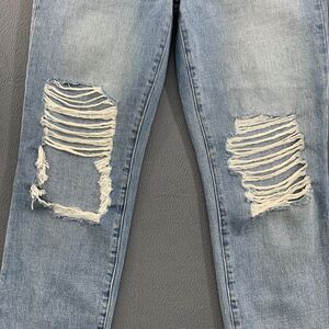 Features: Five-pocket styling, zip fly with button closure, distressed ripped knees, raw unfinished hems