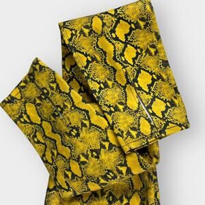 A high-rise skinny jean In premium stretch denim with an edgy snake print set against a vivid yellow background. Channeling an '80s vintage vibe, a sleek front center seam extends down each leg from pocket to an alluring ankle slit. High-recovery denim design hugs from waist to ankle, slimming and smoothing the silhouette. Finished with a faux front pockets for a clean fit. Front zip fly closure and black button.