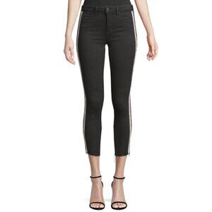 High waisted. Skinny crop leg. Raw edge hem. 2 - 1/2" wide, crystal side-stripes.