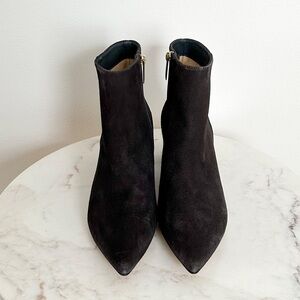 Velvety suede softens the streamlined silhouette of a chic pointy-toe bootie perched on a block heel.