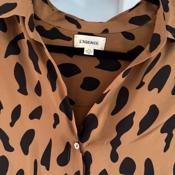L'Agence animal print silk blouse with button closure through the front, collar, long sleeves, and rounded back hem.
