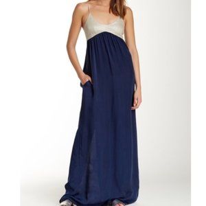 L'AGENCE Navy Summer Silk Maxi Dress with Silver Linen Bodice, Size S