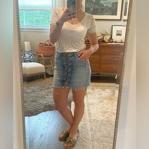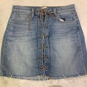 L’Agence Portia Denim Mini Skirt in Desert Light color. Size 25. Gray suede ties and corset front. Excellent condition.