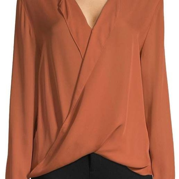 This feather-light L'AGENCE blouse is styled with a slouchy wrap front. Fold-over collar. Long sleeves and button cuffs.