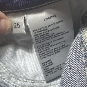 Great pair of L'AGENCE denim flare medium wash jeans in a size 25, 26/27, and X 30. These women's jeans feature a flared style, medium wash, and are made of denim fabric. The jeans are in a classic blue color, perfect for everyday wear and can be dressed up or down for various occasions. Made by the brand L'AGENCE, these jeans offer a stylish and comfortable option for women looking to add a versatile piece to their wardrobe.