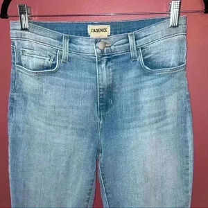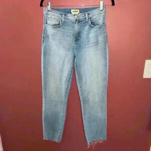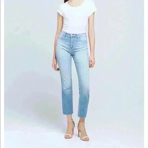 Color ASHFORD An essential cropped jean with a high rise, slim straight leg, and raw hem. Classic five-pocket construction is cut from premium stretch denim in light blue. Meticulous, hand-sanded fading from waistband to knee elongates and highlights the leg.