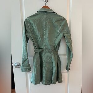 Jacket in 'clover' army green. Mid-weight stretch twill, unlined, self-belt with gold belt loops, button-front with 4 pockets.