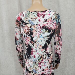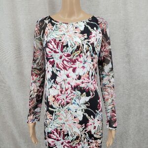 L'AGENCE Silk Floral Midi Dress with Mesh Long Sleeves Black Women's Size 8