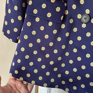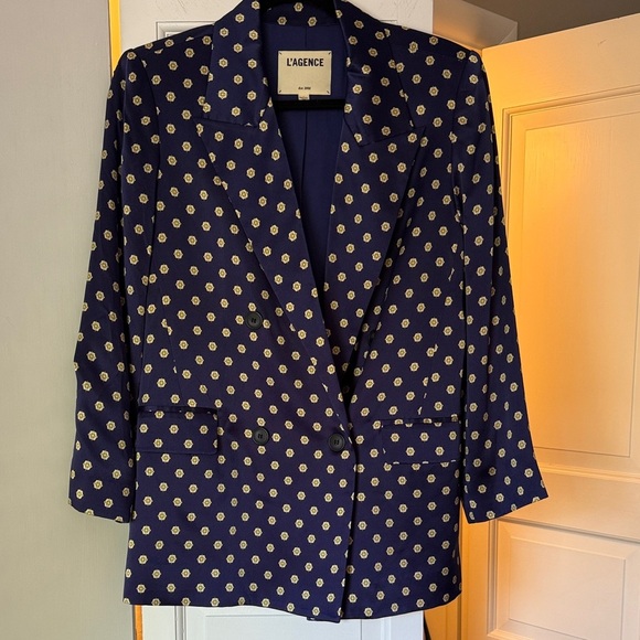 Keywords: L’AGENCE blazer, silk blazer, navy gold polka dot, designer jacket, tailored blazer, double-breasted jacket, luxury workwear, evening blazer, statement piece, silk outerwear