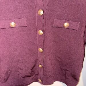 L’AGENCE Toulouse Cardigan. Dark Syrah maroon with gold hardware. Power knit. Strong shoulders. Faux welt pockets. Embossed dome button closures. Size small. New with tags