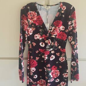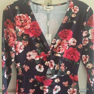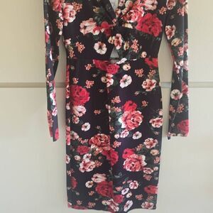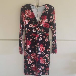 L'AGENCE V Neck Bodycon Blk Floral Prt Knit Midi Dress, Keyhole Waist, NWT, XS