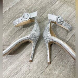 Metallic suede high-heel sandals embellished with crystals and a circular buckle at the ankle.