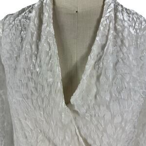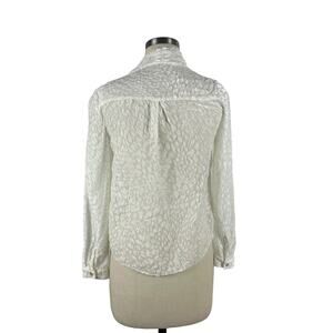 White leopard animal print Lydia drape surplice blouse from L'agence in size XS. There's a discoloration on the front neckline as shown - I tried to get it out and put it in the washer and air dried. Can be worn tucked in as shown or maybe fixed.