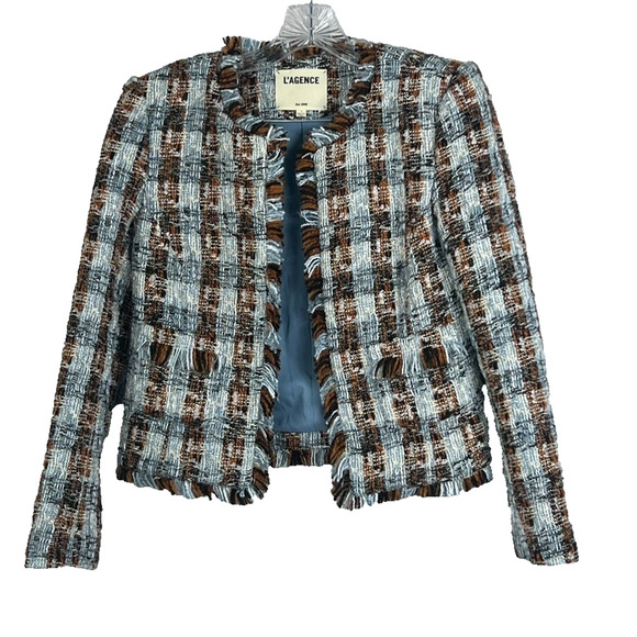 The L'AGENCE Angelina Fringed Tweed Blazer, a piece that seamlessly combines classic style with a playful plaid pattern in hues of blue, orange, and white. The blazer boasts a timeless tweed fabric with a modern fringed accent that adds a touch of edgy sophistication. Attention to detail is evident in the blazer's construction with its collared design and long sleeves offering a classic fit. It's a regular size 2, tailored to flatter without sacrificing comfort. Carefully crafted with a polyester lining for ease of wear and a dry clean only garment for longevity, this blazer is a statement piece that transitions effortlessly through fall, spring, and winter.