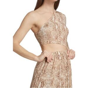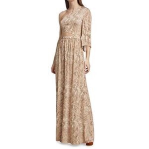 Inspired by a laid-back West Coast feel, Los Angeles-based L'AGENCE creates ready-to-wear with a luxurious edge. The Fontana one-shoulder dress is designed in a maxi length with a snakeskin print.