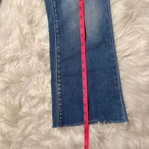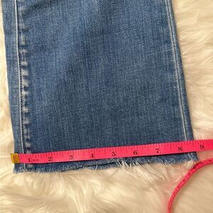 L'AGENCE Kendra High Rise Crop Flare Jeans. A high-rise cropped flare jean in in light-blue premium stretch denim. Hugs from waistband to knee before extending into a flared cropped leg finished with raw hem. Meticulous sanding on hip, thigh, and seat gives denim a vintage look. Classic five-pocket construction and front zip fly closure.
