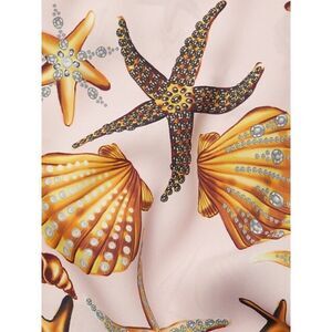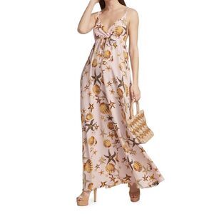 A feminine maxi dress offered in a seashell-and-starfish print set against a pale pink background. Surplice empire bodice with adjustable spaghetti straps and deep open back and sides, falling just below mid-back. Style fastens with a tie at the empire waist before releasing into a dramatic maxi skirt with exquisite drape and flow.