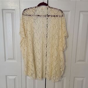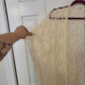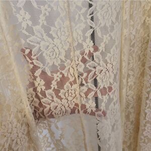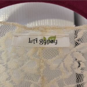 LA Gypsy off white floral see threw open cardigan, no size tag (measurements approximately at bottom of description), no contents tag, oversized sleeves, material splits at sides from armpit to hem, very soft stretch material, excellent condition.