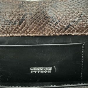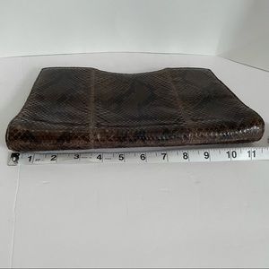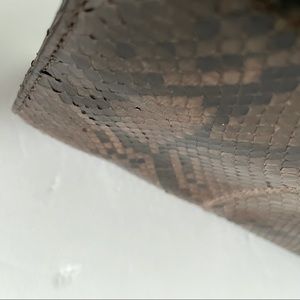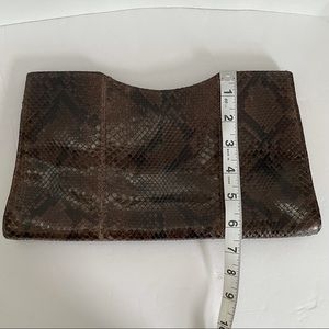 Brown python clutch with silver-tone hardware. Tonal leather lining with one zip pocket as well as one card slot. Magnetic closures at top. Minor lifting of the scales on parts of the bag (see photos). Measurements in separate photos.