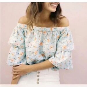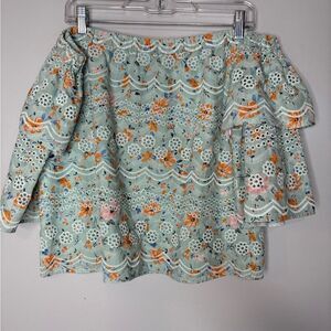 Size Large. Excellent condition. This sweet off the shoulder top from Anthropologie by LAIA gives off boho vibes for warm weather to come. Pair it with a pair of distressed girlfriend jeans and Birkenstock's for keeping casual. Tiered sleeves add a touch of femininity! Condition: Excellent Like New Material: 100% Cotton Color: teal/mint green Fit: Off The shoulder eyelet top, floral embroidery, 3/4 sleeve, print, tiered flutter sleeves, ashtabula, boho, floral romantic date night pastel