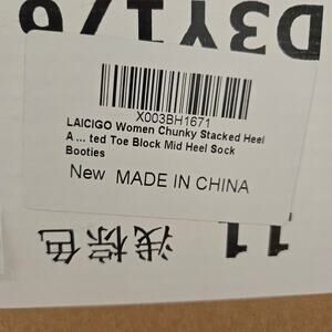 Size 11 Standard Width, Man Made Material, Made in China; Studs around the sole and upper portion; Zipper up the back of the boot, block stacked heel 2 3/4 inches high;