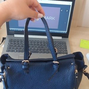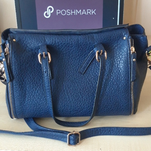 It is a medium size dark blue hand bag. Has adjustable shoulder strap to be worn on shoulder or crossbody.
