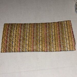 Stylish woven clutch featuring a blend of many colored hues. Perfect for adding a touch of elegance to any outfit.