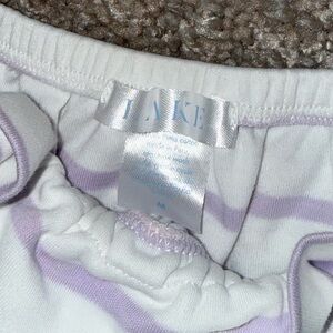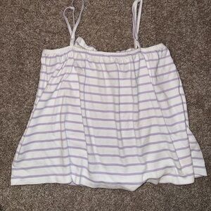 White with purple stripe, adjustable straps, ruffle. No stains.