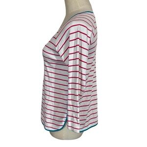 The Pima Long Sleeve top in Ruby, pinky-red stripes with a deep teal contrast, features a scoop neck and three-quarter length sleeves. Made of 100% Pima Cotton.