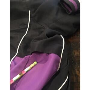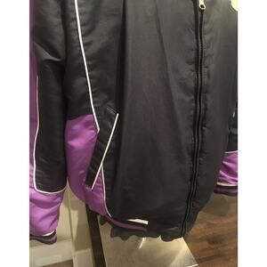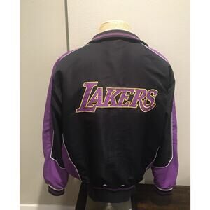 Los Angeles Lakers Reversible Jacket. No sign of wear other than the two areas on zipper. Also, loose threading that can be fixed easily and staining on the gray fabric. Needs light cleaning. All these areas are pictured and price considered. Otherwise, this bomber style jacket looks great. Size is not indicated, but it looks like a men’s medium or large. Please refer to approximate measurements below. Taken zipped and flat.