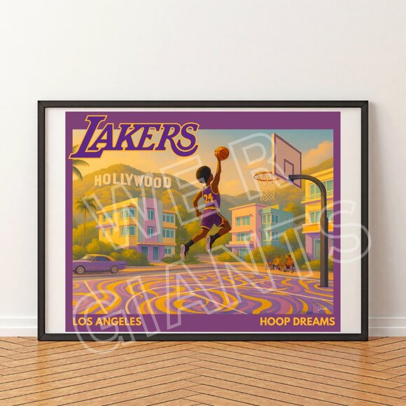 The Lakers Hoop Dreams Collection print measures 20"x16" and features a basketball theme inspired by the iconic Lakers team and Streetball. This art piece captures the essence of hoop dreams and the excitement of Lakers basketball, making it a perfect addition to any sports or art enthusiast's collection. With its vibrant colors and dynamic design, this print is sure to bring a touch of inspiration and nostalgia to any space.