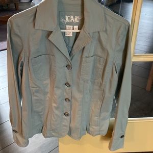 Darling lightweight jacket w beautiful jeweled buttons down the front and on the cuffs. It is shorter in length and so comfortable. Bluish-green.