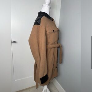 camel sherpa jacket, teddy coat, belted shacket, faux shearling coat, fall outerwear, winter jacket, cozy teddy shacket, neutral outerwear, brown sherpa coat, chic cold weather coat, warm fleece jacket, trendy fall coat, plush belted jacket, vegan leather trim coat, street style outerwear