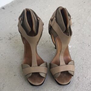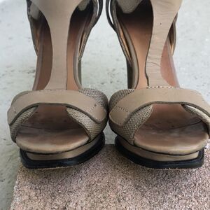 Tan Khaki color. Please look at the pictures. I show that they need some cleanup heel is 5 inches platform is 3/4 inch.
