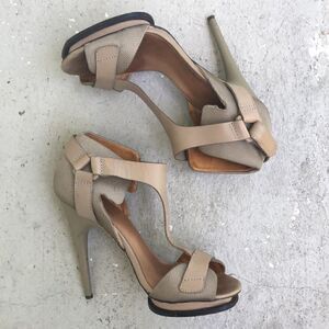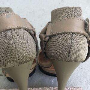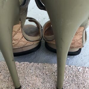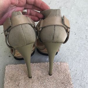 Tan Khaki color. Please look at the pictures. I show that they need some cleanup heel is 5 inches platform is 3/4 inch.