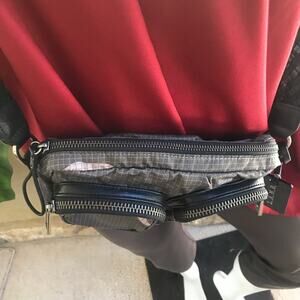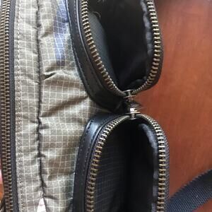 L.A.M.B. Gwen Stefani Camo Green Crossbody Bag with Zipped Pockets. 10.5 inches across, 7 inches tall, 4.5 width on bottom including pocket.