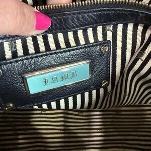 Gold hardware and magnetic snap closure. Bag has two front outside pockets, one zippered inside pocket and three additional pockets on the inside.