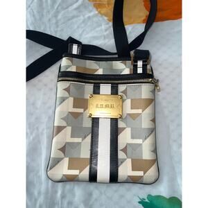 Authentic L.A.M.B. crossbody bag with signature geometric logo print in beige, tan, and gray tones. Features bold black and white center stripe, front gold logo plate, zip closure, and adjustable canvas strap. Compact and lightweight, perfect for daily wear. Excellent condition.