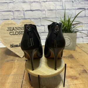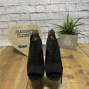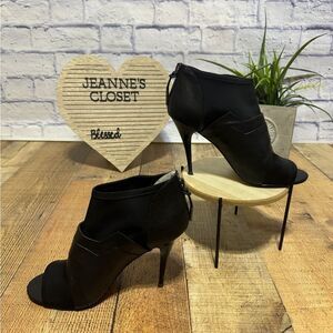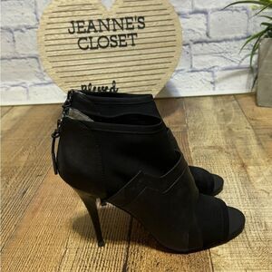 Luxurious L.A.M.B. Black on black high heeled soft leather flexible neoprene open toe booties.