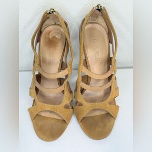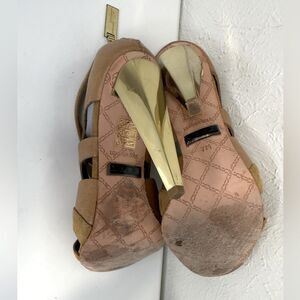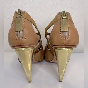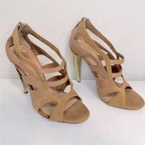 L.A.M.B. Dominica Tan Peep-Toe Gold Heel size 7