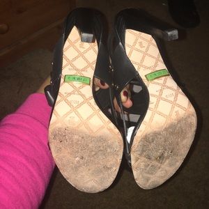 A trifold rosette and gleaming nail-head studs adorn the wide instep strap of a chic leather sandal balanced atop a towering stacked heel. Ankle strap with buckle closure. Approx. heel height: 4 1/2". Leather upper, lining and sole.