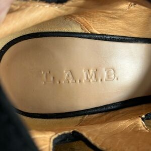 Excellent preowned condition. Black suede body with tan leather interior lining and four velcro closures. Bottom leather sole in good condition. Minor wear on heel shaft.