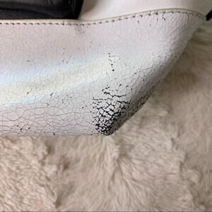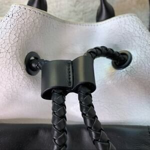 L.A.M.B. Gracie white and black crackle backpack. White crackle finish with black accents and trim. Double backpack straps. Braided leather drawstring with snap closure. Front flap pocket. Interior zip pocket. Studded feet on bottom. Excellent preowned conditon. Very clean. No dust bag or box included.