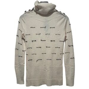 Elegant cashmere sweater perfect for upscale casual wear. Featuring a unique textured embellishment in a horizontal dash pattern throughout, this cream knit sweater includes a cozy turtleneck with button detailing at the neck and two front pockets for a practical touch. Its refined design and comfortable fit make it suitable for a variety of occasions. Ideal for a sophisticated brunch, a casual office setting, or a chic weekend outing. There are two spots where the sweater was repaired with cashmere patches. See patches near the edge of the black thread on front and at the armpit, see last two photos. No size tag so please see measurements below.