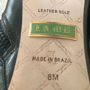I AIN'T NO HOLLA BACK GIRL! These fabulous boots are from Gwen Stefani's L.A.M.B. line. They are covered platform boots (1 inch platform) with a 4.5 inch heel in a dark hunter green. Size 8 these leather boots are brand new in box and have never been worn. They pull on with a partial zip on the inside. The buckles add to the bad girl nature of these boots.
