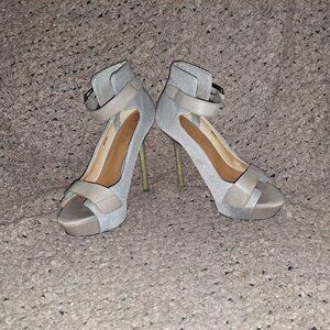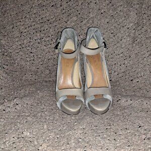 L.A.M.B. Gwen Stefani-Greige Leather Ankle Strap-Silver Nylon-Sz 6.5-Excellent
