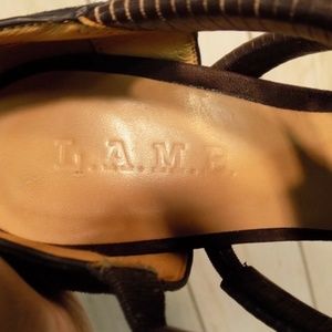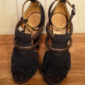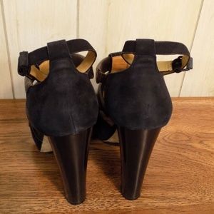 Navy Suede with 100% Leather Chocolate straps and leather sole. Chunky heel measures approximately 4" and platform measures approximately 0.75". These are sexy, fun, versatile and comfortable. Finding a classy-looking navy shoe isn't easy and these are gorgeous and unique! Pre-loved, barely worn, like new. No box.