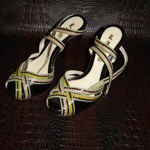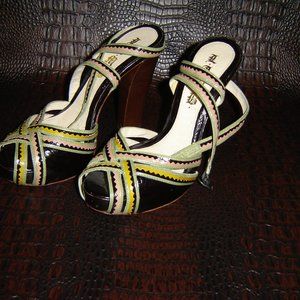 Gently pre-owned L.A.M.B multi-color Peep Toe Chunky Platforms size 7.5 M. Black base with black, green, mustard and mauve/pinkish single buckle ankle straps. Brown wooden chunky heels. Heels measure 5" Leather sole. Made in Brazil. Sole shows very little signs of wear. Overall in very, very good pre-owned condition.